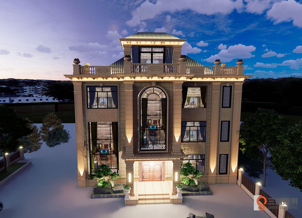 別墅燈光采用3D漫游設(shè)計,燈具采用專業(yè)工程款瓦楞燈、洗墻燈、LED投光燈、高檔柱頭燈、壁燈、草坪燈等,整體燈光營造浪漫、溫馨的環(huán)境。